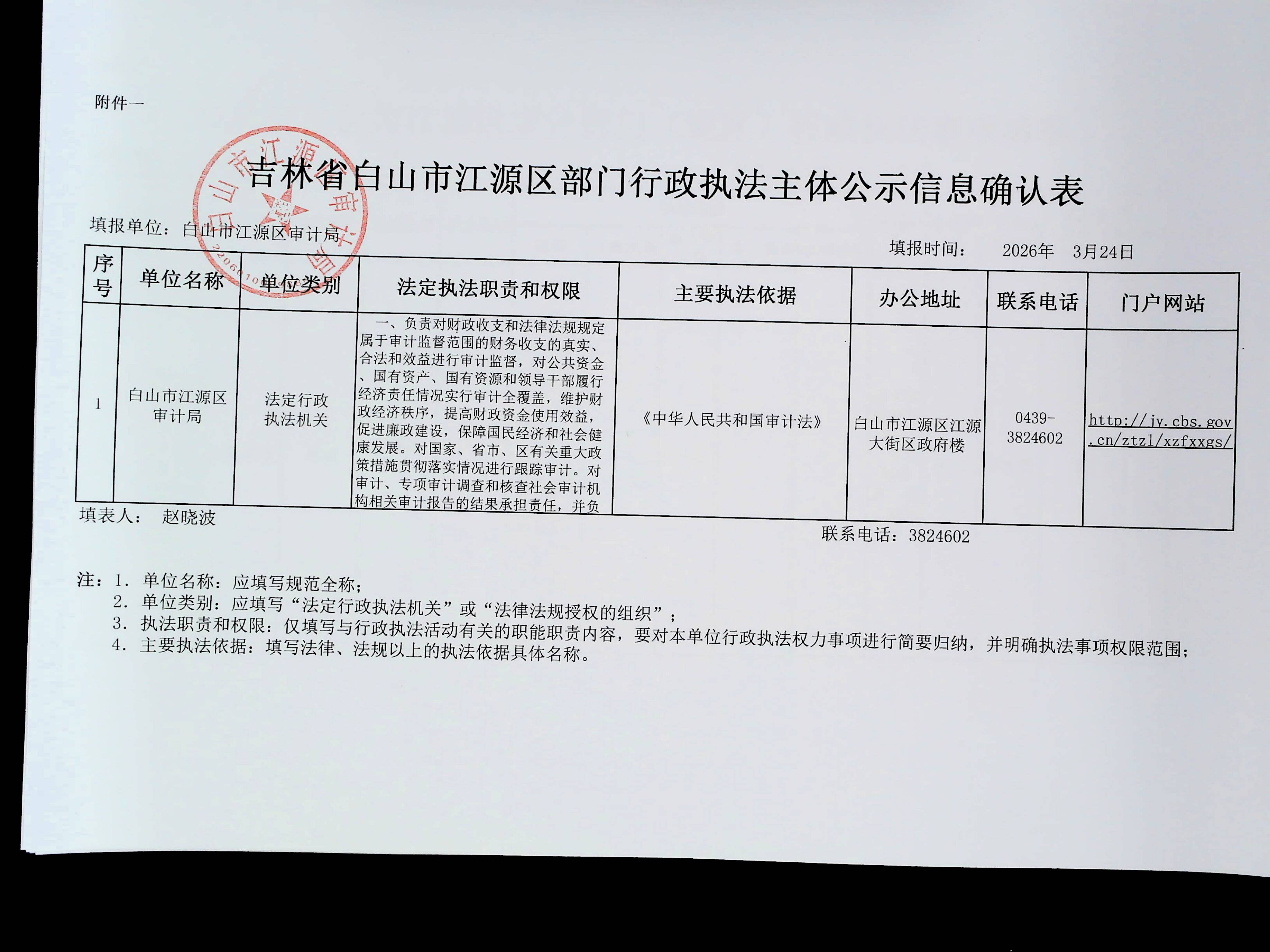 江源区审计局行政执法主体公示信息确认表