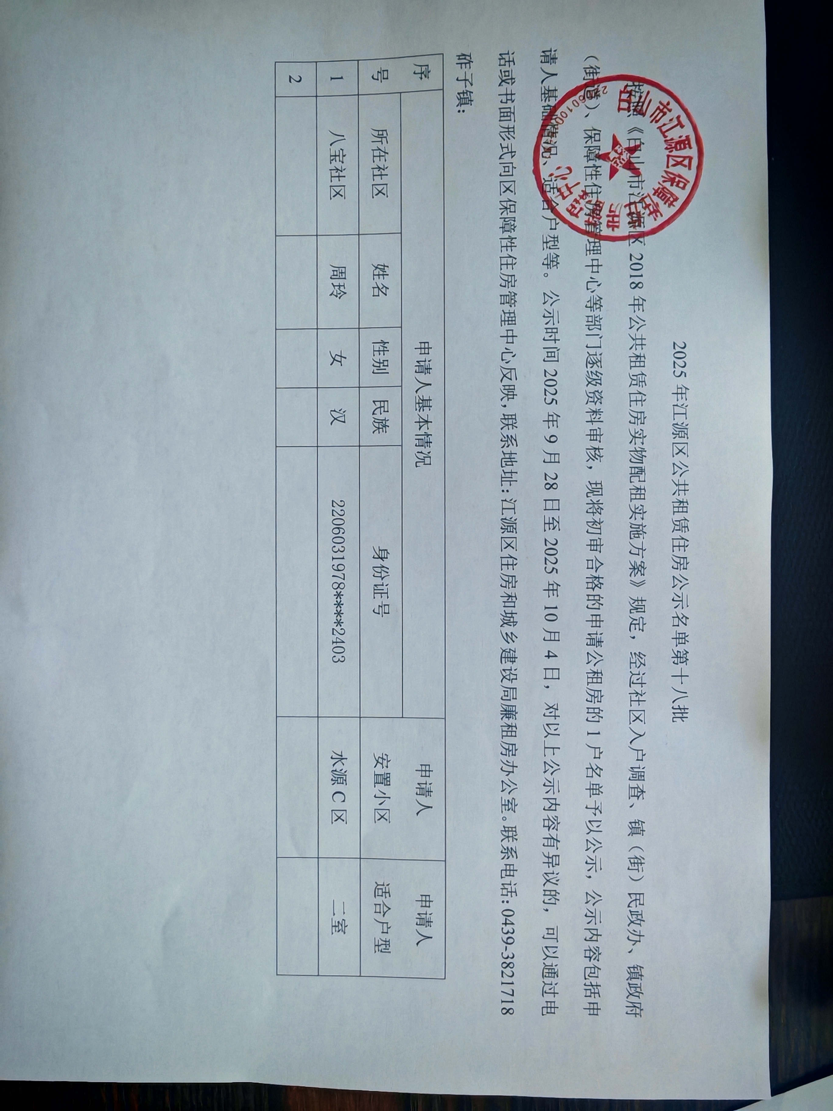 2025年江源区公共租赁住房公示名单第十八批
