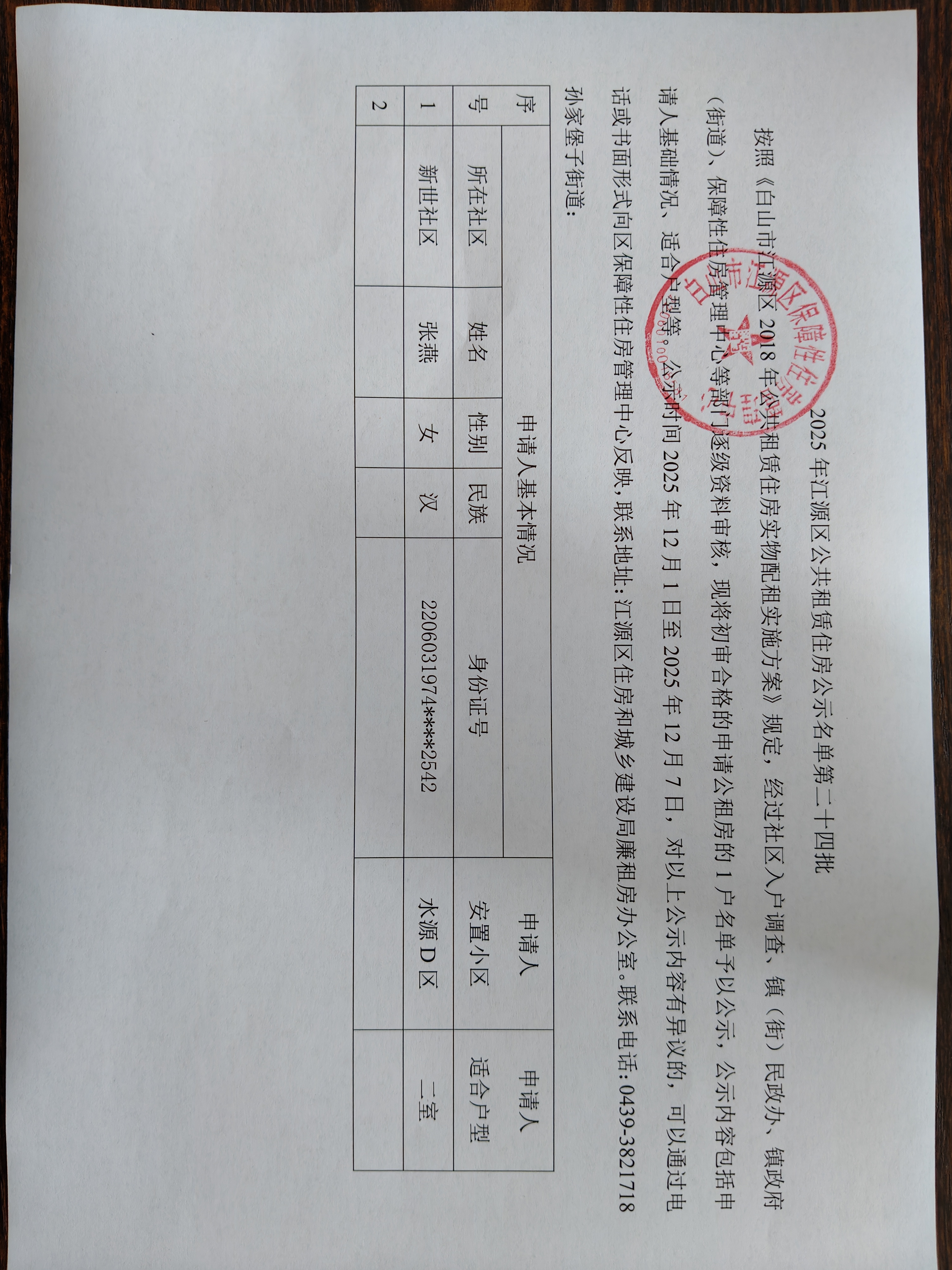 2025年江源区公共租赁住房公示名单第二十四批