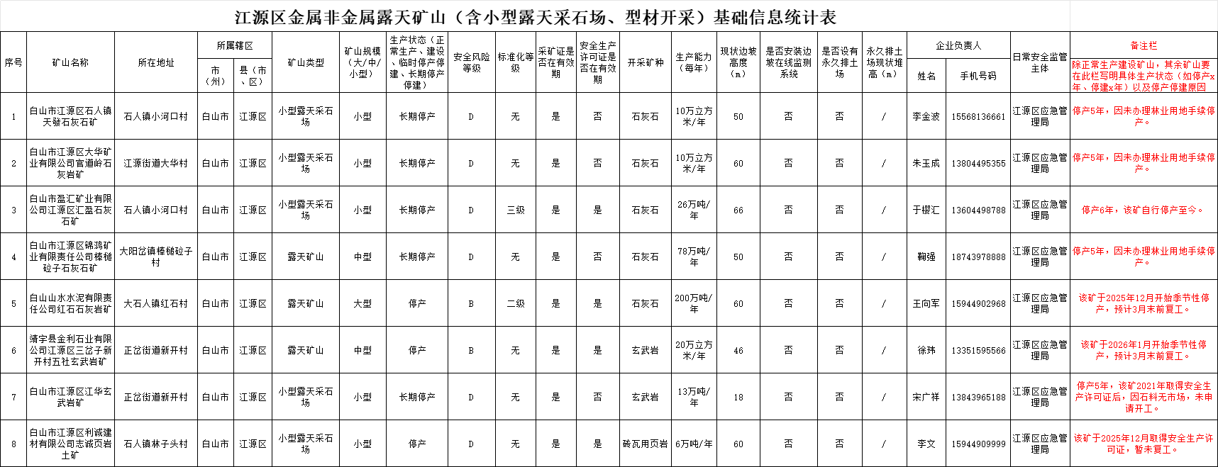 江源区金属非金属露天矿山(含小型露天采石场、型材开采)基础信息统计表