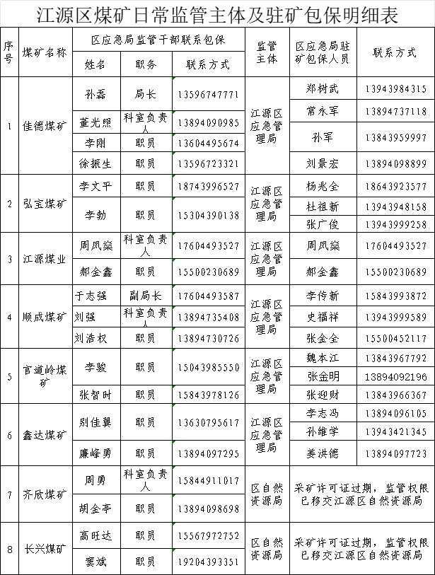 江源区煤矿日常监管主体及驻矿包保明细表
