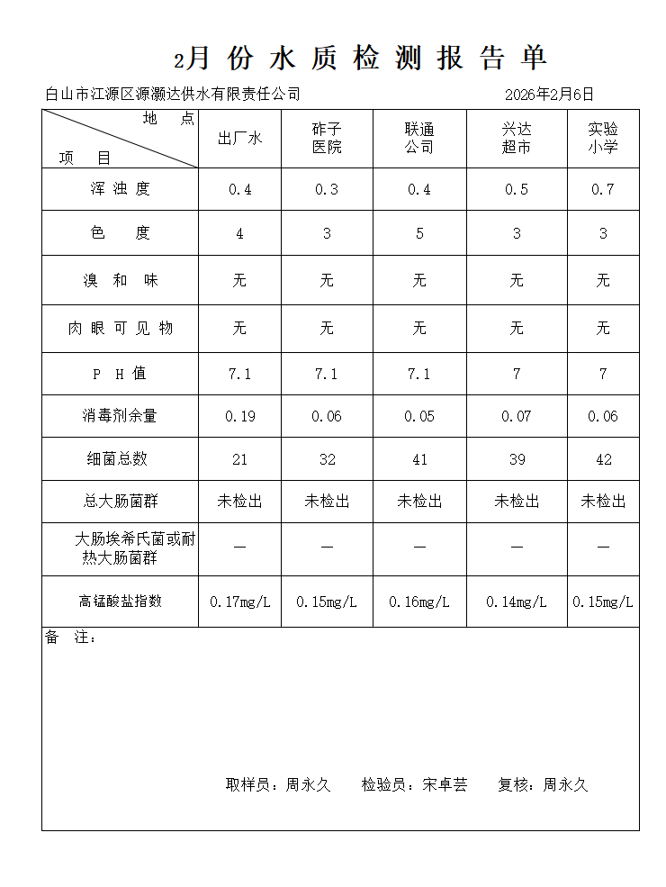 2月份水质检测报告单