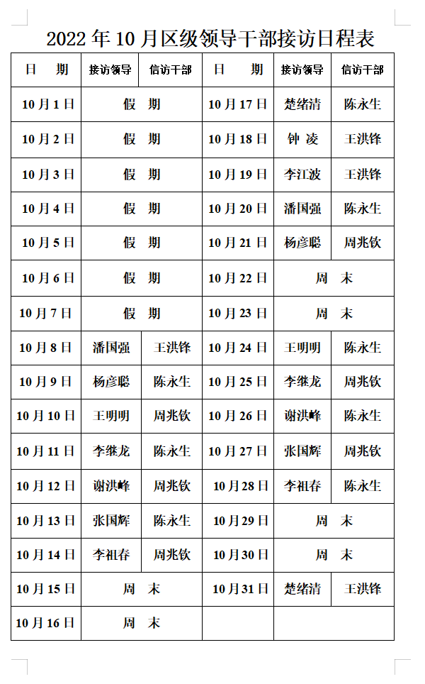 2022年10月区级领导干部接访日程表